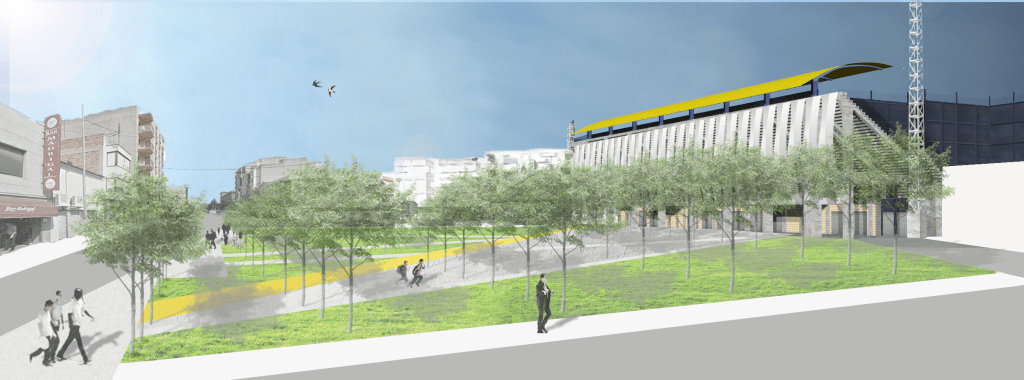 Sobre el trazado se dibuja una diagonal que conecta las taquillas y la calle Blasco Ibañez que da acceso a la tribuna del estadio con la plaza del Labrador, lugar de celebración de los logros del Villarreal C.F. Cobra relevancia con un ancho mayor, de cinco metros, y con un pavimento de hormigón coloreado en amarillo, color distintivo del club y de Vila-real.